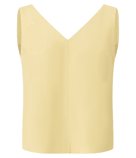 Os destaques ficam por conta da calça de couro sintético em tom bordô, que traz um toque de sofisticação e modernidade, e os acessórios dourados que iluminam o visual, criando um contraste elegante com o amarelo suave da regata.