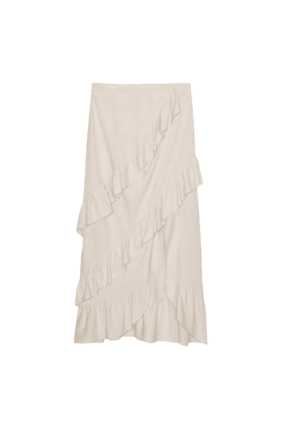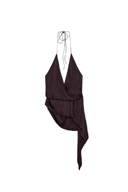 Este look exala elegância e sofisticação, perfeito para eventos noturnos. A blusa halter drapeada em tom ameixa escuro confere um ar moderno e sensual, enquanto a saia midi bege com babados adiciona um toque romântico e fluido. O scarpin slingback com estampa animal print é o ponto de destaque, injetando personalidade e ousadia. A bolsa de ombro em tom neutro e as joias douradas, como o colar longo e os brincos pendentes, complementam o conjunto com refinamento, criando uma harmonia visual impecável para quem busca um estilo marcante e chique.