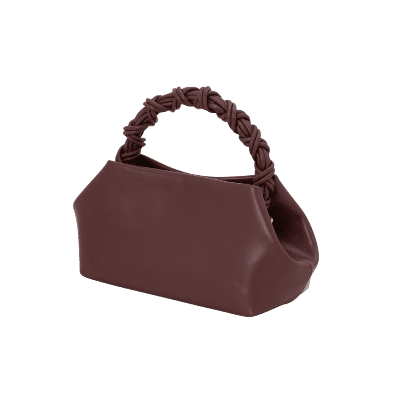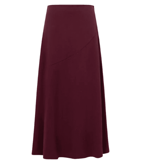 As peças-chave são o blazer e a saia midi na cor vinho, uma camiseta branca de gola alta, sapatilhas Mary Jane e uma bolsa de mão com alça trançada, complementados por óculos de sol.