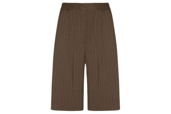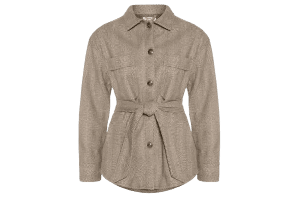 As peças-chave são a jaqueta shacket com cinto, que traz um ar moderno e elegante, a calça pantalona risca de giz para um toque clássico e os sapatos slingback anabela, que combinam conforto e sofisticação.