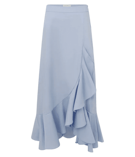 Este look feminino exala leveza e elegância, perfeito para os dias ensolarados da primavera e verão. A saia midi azul claro com detalhes de babados traz um toque romântico e fluido, combinada harmoniosamente com uma camiseta branca de gola alta, que oferece um ar moderno e minimalista. As sandálias rasteiras douradas adicionam um brilho sofisticado e garantem conforto, enquanto os óculos de sol marrons e a pulseira prateada completam o visual com estilo. Ideal para passeios, almoços ou um happy hour descontraído, este conjunto é a definição de casual chic.