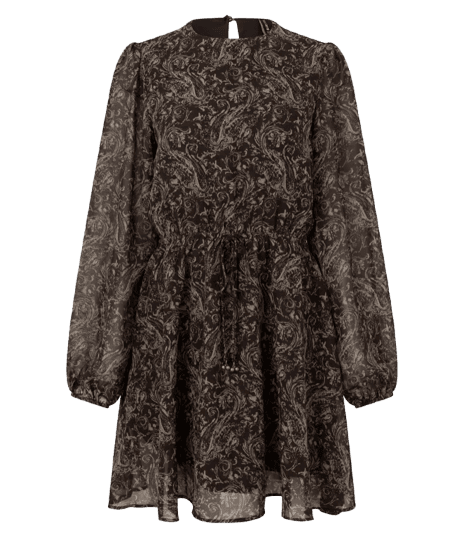 Este look exala uma elegância descomplicada, perfeito para a mulher moderna que busca sofisticação e conforto. O vestido estampado de manga longa, com seu padrão paisley em tons terrosos, é a peça central, oferecendo um caimento fluido e charmoso. Combinado com botas de cano alto em um tom marrom profundo, o visual ganha um toque de refinamento e é ideal para as estações mais frescas. A bolsa de ombro em camurça e os acessórios dourados, como o colar de elos e os brincos florais, complementam o conjunto, adicionando brilho e textura. Uma escolha versátil para diversas ocasiões, do ambiente de trabalho a um jantar especial.