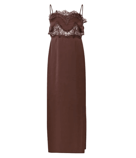 O slip dress midi em tom marrom confere um toque de elegância e sensualidade sutil. Sua simplicidade permite que a jaqueta jeans e os acessórios adicionem personalidade e um ar casual chic à produção.