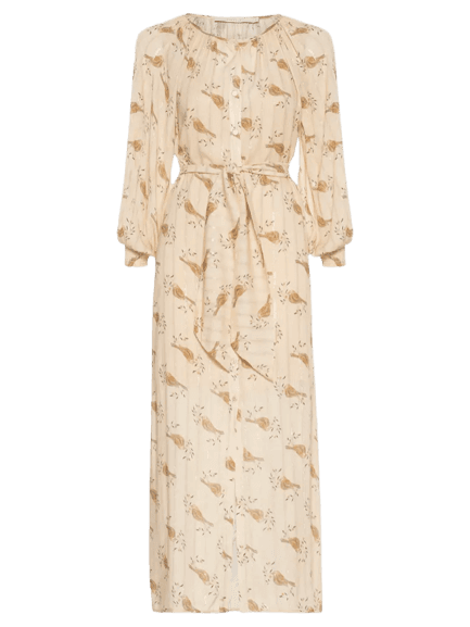 Este look exala uma elegância descontraída e um charme natural, ideal para os dias ensolarados. O vestido longo estampado com delicados pássaros e amarração na cintura é a peça central, transmitindo leveza e feminilidade. Por baixo, um vestido slip creme adiciona uma camada sutil e versátil. A sapatilha trançada em tons neutros, com seu detalhe de corrente, e a bolsa hobo de ráfia complementam o visual com texturas orgânicas e um toque artesanal. Brincos de pino discretos finalizam o conjunto, que é perfeito para um brunch, um passeio no parque ou um encontro casual, unindo conforto e estilo em perfeita harmonia.