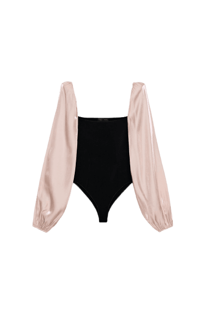 Um look que exala modernidade e elegância, perfeito para transitar entre o dia e a noite com muito estilo. O body de manga bufante em tom rosa claro contrasta harmoniosamente com a saia de couro sintético preta, criando uma silhueta sofisticada. A sapatilha dourada de tela adiciona um toque de glamour e conforto, enquanto a bolsa estruturada preta e os brincos pendentes arrematam a produção com um toque final de requinte. Ideal para happy hours, jantares ou eventos que pedem um visual marcante e atual.