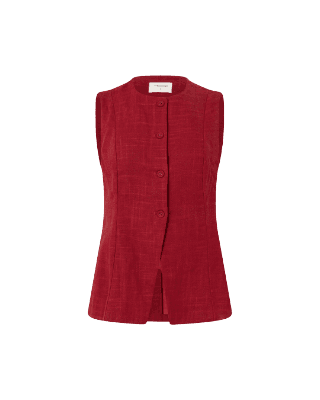 Este look exala uma elegância casual chic, perfeito para quem busca estilo e conforto. O colete alongado vermelho vibrante é a peça central, adicionando um toque de cor e sofisticação. Combinado com shorts brancos texturizados, o visual se torna fresco e moderno. A sandália de salto bloco dourada, a bolsa de ombro marrom e os acessórios dourados – como o relógio e os colares – elevam o conjunto, conferindo um brilho sutil. Os óculos de sol tartaruga finalizam com um toque de glamour. Ideal para diversas ocasiões, do almoço ao happy hour.