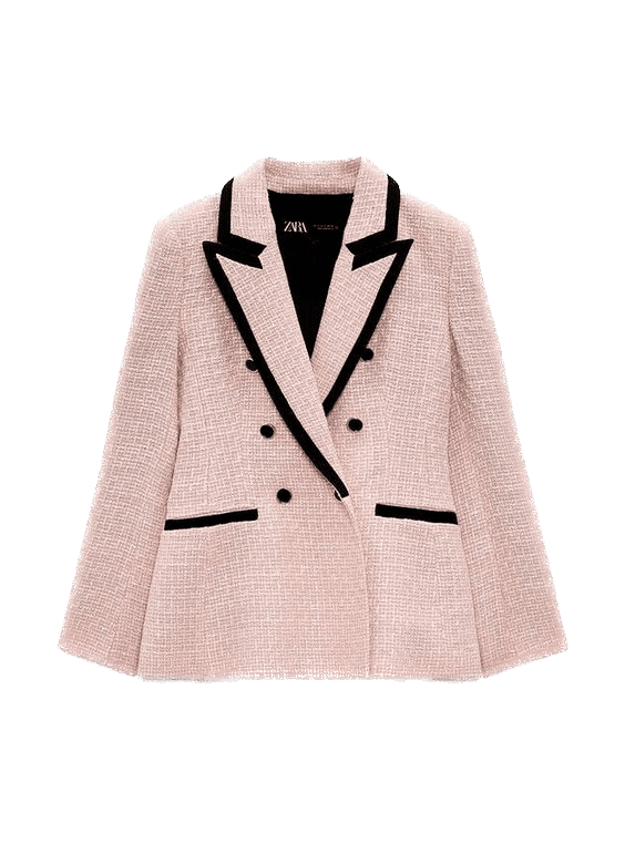 O blazer tweed rosa é a peça-chave que confere um toque de elegância clássica e modernidade ao look. Sua textura e cor suave adicionam sofisticação, enquanto o corte estruturado mantém a formalidade necessária para diversas ocasiões.