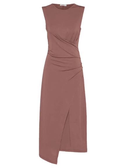Este look exala uma elegância descomplicada, perfeito para a mulher moderna que busca versatilidade. O vestido midi em tom rosé, com seu drapeado sutil e fenda lateral, oferece um caimento impecável e um toque de sofisticação. A sandália slingback anabela na cor vinho adiciona conforto e um contraste de cor interessante, enquanto a bolsa tiracolo com tachas douradas e os brincos alongados complementam o visual com um toque de personalidade. Os óculos de sol gatinho arrematam o conjunto, ideal para transitar com estilo do dia à noite, seja em um almoço de negócios ou um happy hour.