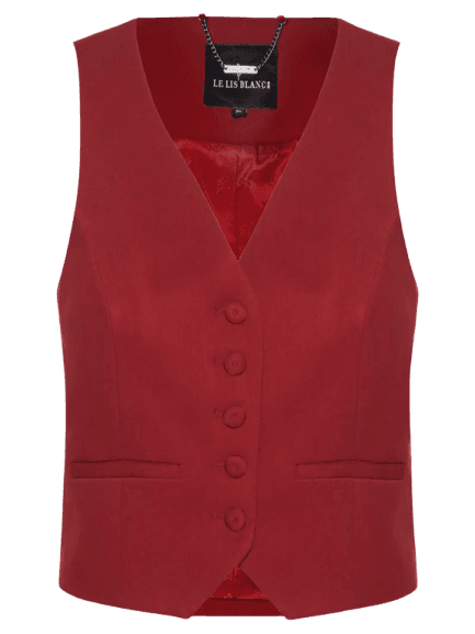O colete vermelho é o ponto focal. Combine-o com peças neutras como a pantalona branca para um contraste elegante e sofisticado, permitindo que a cor vibrante se destaque.