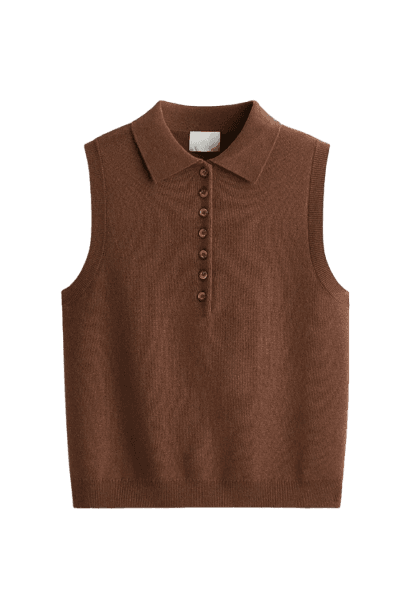 Este look casual chic é a definição de elegância descontraída, perfeito para quem busca conforto sem abrir mão do estilo. A combinação do colete de tricô marrom, com sua gola polo e botões, com a fluidez da saia midi branca, cria um contraste harmonioso e sofisticado. Os acessórios, como a bolsa de ombro marrom e as sandálias rasteiras bordô, adicionam um toque de cor e textura, enquanto os óculos de sol tartaruga completam o visual com um charme atemporal. Ideal para diversas ocasiões diurnas, do trabalho ao lazer.