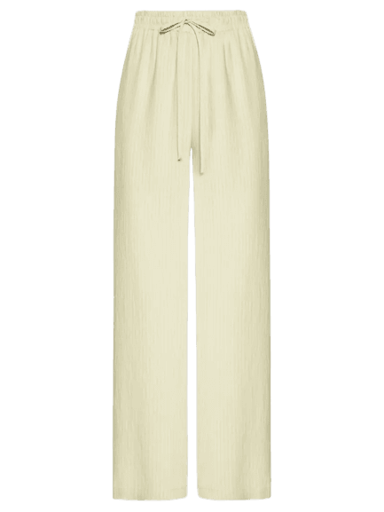 Acessórios em palha, madeira e metais dourados complementam perfeitamente este look. Bolsas estruturadas ou cestas, colares longos e pulseiras discretas realçam a sofisticação natural e o toque artesanal.