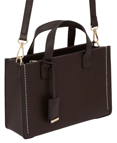 Este look exala sofisticação e versatilidade, ideal para a mulher moderna que transita entre compromissos profissionais e eventos sociais com elegância. O vestido midi marrom de um ombro só, com seu caimento fluido e detalhe drapeado, é a peça central, oferecendo um toque de sensualidade discreta. O blazer preto, jogado sobre os ombros ou vestido, adiciona uma camada de formalidade e estrutura, tornando o conjunto perfeito para o ambiente de trabalho ou um jantar de negócios. Complementam o visual a sandália de salto bloco nude, que garante conforto e alonga a silhueta, a bolsa estruturada marrom, prática e chic, e os óculos de sol tartaruga, para um toque final de glamour.