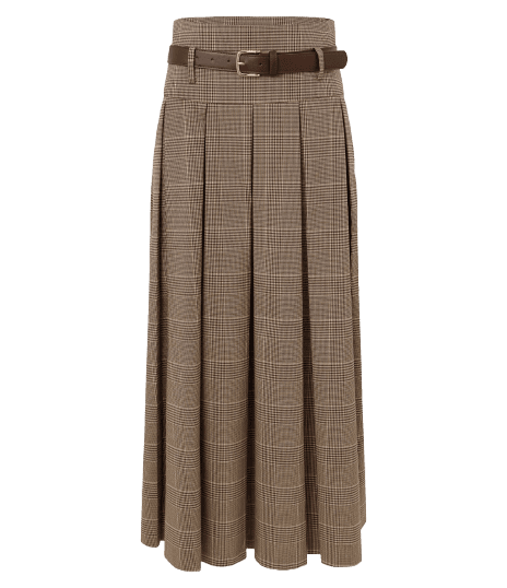 Este look exala uma sofisticação casual, perfeito para a mulher moderna que busca elegância e conforto. A saia midi plissada em padrão xadrez, com seu cinto fino marcando a cintura, cria uma silhueta alongada e clássica. A blusa de alça com listras discretas adiciona um toque de leveza e modernidade. As mules de salto na cor vinho trazem um ponto de cor vibrante e um ar contemporâneo, enquanto os brincos de gota prateados finalizam a produção com delicadeza. Uma combinação versátil para o dia a dia no escritório ou eventos sociais.