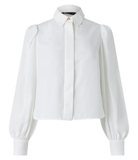 Elegante e casual, este look feminino combina uma blusa branca de mangas volumosas com jeans escuros, criando um contraste sofisticado. Completo com acessórios dourados, como brincos e colar, o visual é finalizado com sapatos de salto marrom e uma bolsa preta robusta. Ideal para eventos casuais que exigem estilo.