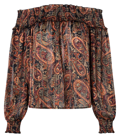 Este look feminino combina o frescor casual com elegância, apresentando uma blusa de ombro a ombro com estampa paisley, calça marrom de cintura alta e sandálias plataforma. Acessórios em tons terrosos, como brincos de argola e uma bolsa estruturada, complementam o visual, ideal para um encontro descontraído em dias quentes.
