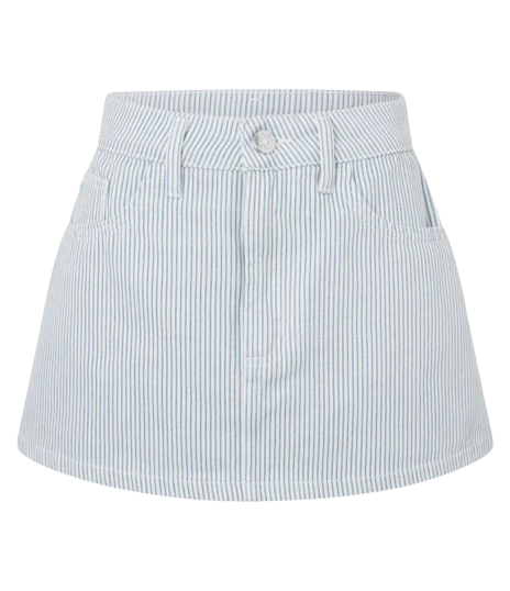Este look feminino combina descontração e estilo com uma t-shirt branca estampada de verão e saia curta listrada em azul claro. Acessórios incluem brincos florais e uma prática bolsa creme a tiracolo, enquanto os tênis cinza garantem conforto e um toque esportivo.