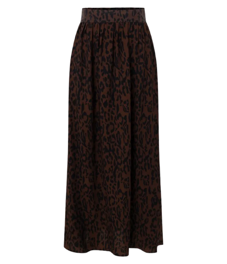 Este look feminino é ideal para um jantar casual. Composto por um top marrom justo que destaca a silhueta e uma saia longa estampada que proporciona elegância. Os acessórios incluem óculos de sol sofisticados e brincos florais. A bolsa transversal e os sapatos com salto discreto completam o visual, adicionando um toque de charme e praticidade.