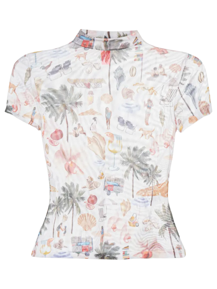 A proposta une conforto e estilo com uma camiseta estampada que contrasta com a calça vinho, criando uma silhueta sofisticada. O tênis prateado adiciona um toque moderno, enquanto os óculos de sol e brincos prateados oferecem charme discreto.
