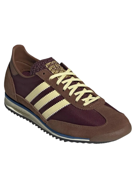 O look feminino aposta na combinação descontraída de uma camiseta estampada com calça amarela de crochê. Os tênis vinho adicionam um toque esportivo, enquanto a bolsa acolchoada marrom oferece praticidade. Óculos de sol escuros e brincos prateados arrematam o visual com estilo e personalidade.