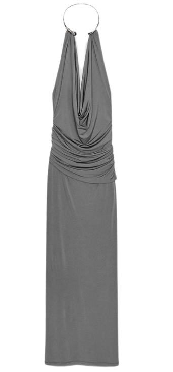 Este look feminino é a personificação da elegância noturna com um toque de glamour moderno. A peça única, um vestido longo cinza com decote halter e drapeado frontal, exala sofisticação e fluidez, ideal para eventos especiais. Complementando com maestria, as sandálias prateadas de salto bloco oferecem um brilho metálico discreto, assegurando conforto e estilo em cada passo. Para um toque final irresistível, a bolsa clutch prateada em formato de coração adiciona charme e um elemento lúdico ao conjunto. Este look é perfeito para mulheres que buscam um visual sofisticado e marcante, unindo glamour e personalidade em perfeita harmonia.