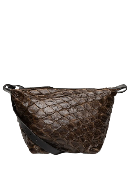 Look feminino elegante e moderno, combina um maiô estampado com tema marinho com uma saia curta de amarração em tecido floral. Sandálias douradas de salto grosso adicionam sofisticação, enquanto brincos longos dourados complementam o visual. A pequena bolsa de ombro marrom trançada adiciona textura.