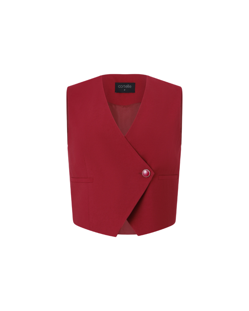 Este look feminino destaca-se pela elegância contemporânea e pela combinação de cores sofisticadas. A parte superior exibe um colete cropped em vermelho profundo, com design minimalista e fechamento por botão, que confere um ar moderno e audacioso. A parte inferior é representada por uma saia assimétrica em tom rosa suave, criando um contraste delicado e harmonioso. Nos pés, delicadas sandálias bege com laços agregam um charme feminino e atemporal. Entre os acessórios, uma clutch texturizada em bamboo adiciona uma nuance natural, enquanto brincos dourados longos e um anel com pedras coloridas oferecem um toque de luxo e personalidade. Este conjunto é ideal para a mulher que deseja expressar sofisticação com sutileza e criatividade.