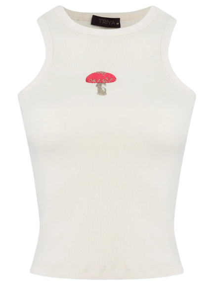 Look feminino moderno e casual com um top sem mangas branco estampado, calça jeans escura e sapatos de salto com design inovador. Completa-se com maxi brincos prateados, óculos de sol com armação dourada e uma bolsa de couro preto, criando um visual equilibrado entre o sofisticado e o descontraído.