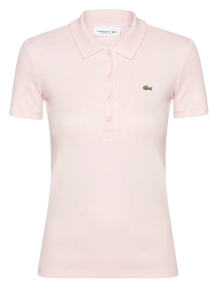 Look feminino casual e fresco, com camisa polo rosa claro combinada a um shorts de cintura alta em tom creme. O visual é complementado por tênis sofisticados em preto e marrom, brincos delicados dourados, óculos escuros elegantes e uma bolsa de palha com alças marrom, ideal para um dia ao ar livre.