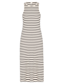 Este look feminino irradia frescor e versatilidade, perfeito para os dias ensolarados. A peça única do conjunto é um vestido listrado em preto e branco, de corte reto e alças largas, confeccionado em tecido leve, que oferece conforto e elegância descomplicada. Complementando o visual, as sandálias flip-flop de solado de palha, apresentam tiras vermelhas trançadas, trazendo um toque rústico e charmoso. Acessórios cuidadosamente escolhidos completam o look: brincos em formato de estrela, adicionando um brilho celestial, e um colar de corrente prateada, que reforça a sofisticação. A bolsa em forma de meia-lua, com estampa de melancia, confere um toque divertido e moderno, ideal para quem busca um estilo descontraído e elegante.