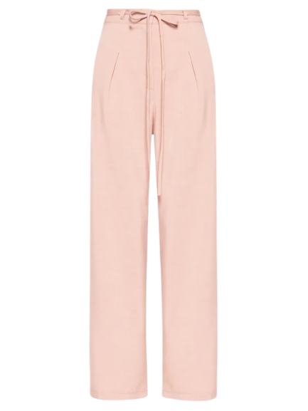 Look feminino sofisticado e casual com blusa branca de um ombro, calça rosa suave e sandálias de salto em tom neutro. A bolsa trançada adiciona textura, enquanto os brincos pendentes dourados com detalhes em tons pastel oferecem um toque de elegância.