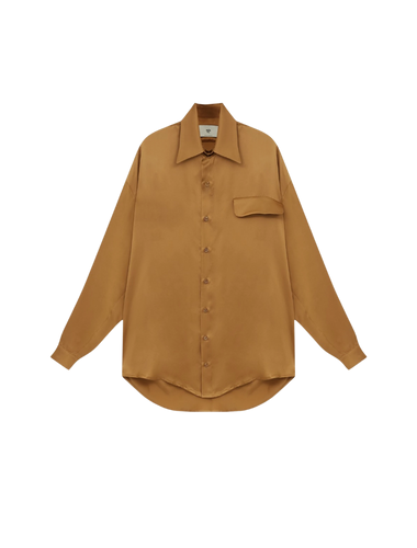 Este look feminino exala sofisticação e elegância. A parte superior é caracterizada por uma camisa de manga longa em seda marrom claro, destacando-se pelos botões delicados que conferem um charme clássico. A parte inferior complementa com uma calça de alfaiataria marrom escuro, proporcionando um contraste harmonioso e um caimento impecável. Nos pés, sandálias em couro e palha, em tons terrosos, adicionam um toque rústico e confortável. O destaque do visual fica por conta da bolsa estruturada em couro marrom com aplicações de tachas douradas, um elemento de designer que enriquece o conjunto. Os óculos de sol arredondados marcam presença sutil, enquanto as joias douradas com pedras verdes acrescentam uma nuance de glamour refinado, ideal para ocasiões formais ou eventos diurnos onde o estilo é prioridade.