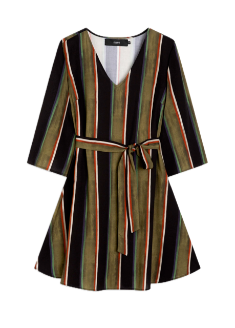Um look elegante com toques de ousadia! O vestido com listras verticais alonga a silhueta e o cinto do mesmo tecido marca a cintura de forma natura (mas se quiser trocar por um cinto de couro marrom ou preto, também funciona!)O casaco de camurça traz textura e deixa o visual mais rico e interessante, use-o aberto ou fechado completamente.A bolsa verde e a sandália coral criam um contraste cheio de personalidade, um truque de cores complementares!O colar em tons quentes conversa com os detalhes do look e equilibra a atenção entre o rosto e o restante da produção.