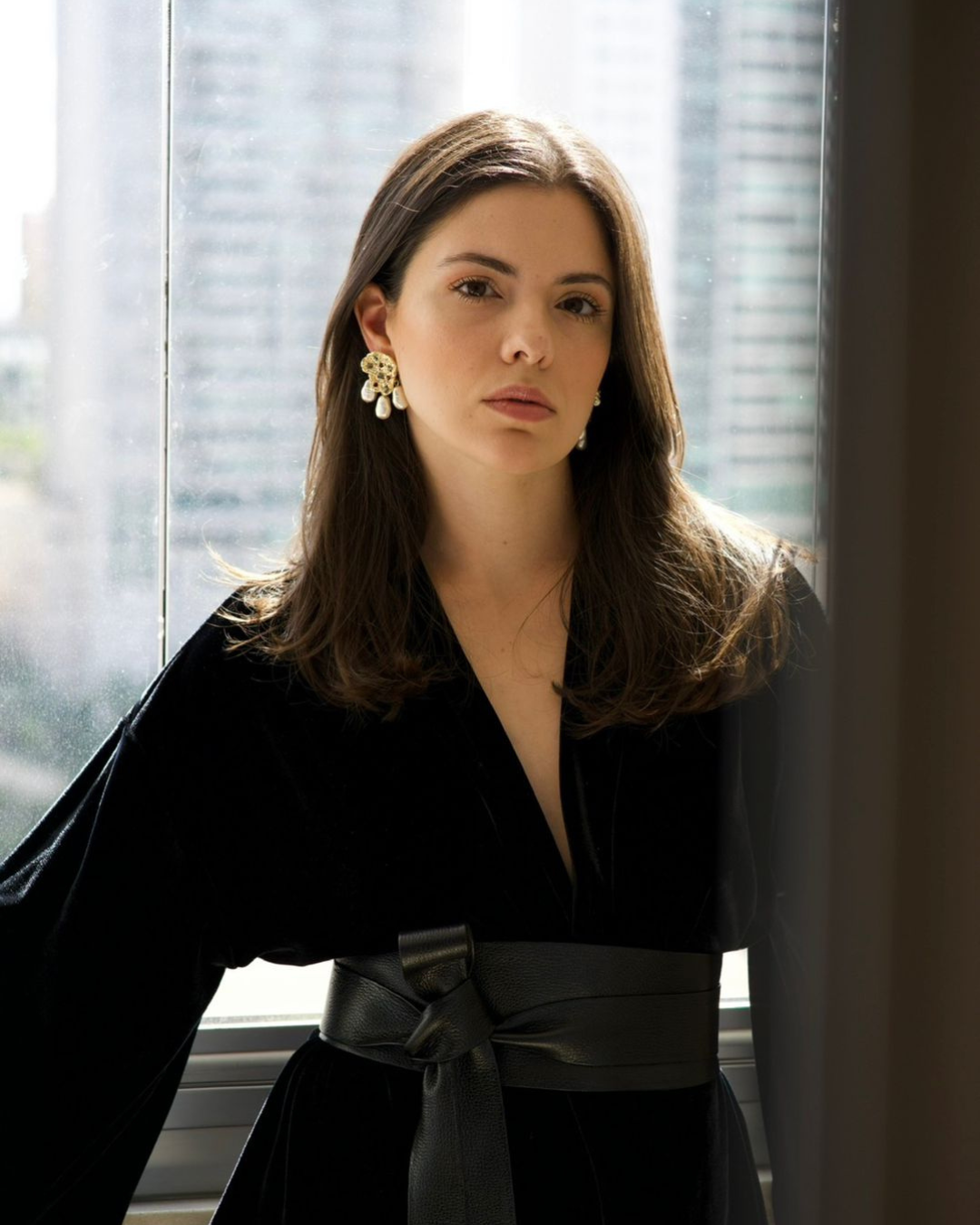 Este look feminino combina sofisticação e simplicidade com um vestido preto longo de corte fluido. Os sapatos brancos com salto baixo adicionam um toque contemporâneo, enquanto os acessórios — incluindo brincos dourados, óculos escuros de armação preta, e uma bolsa poá — incrementam o visual com elegância.