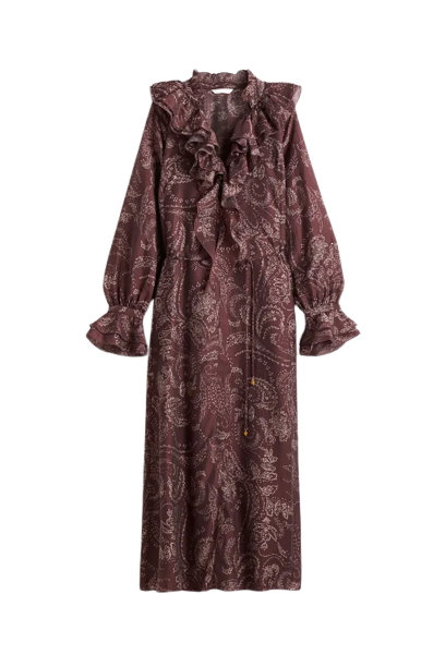Este look feminino é perfeito para um dia casual chic. O vestido longo estampado em tom marsala é a peça central, combinando elegância e conforto. Os sapatos dourados completam o visual com um toque sofisticado, enquanto os óculos escuros e a bolsa de couro marrom adicionam estilo. Os brincos delicados arrematam o conjunto, tornando-o ideal para um almoço ou passeio descontraído.