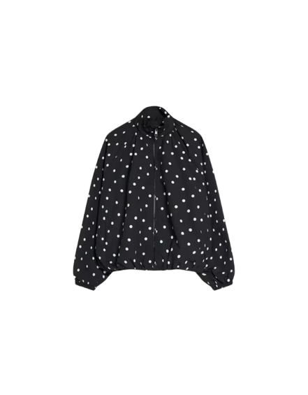 Este look feminino combina elegância e casualidade. A blusa preta de bolinhas confere um toque divertido, enquanto a regata branca clássica garante sofisticação. A calça preta de alfaiataria complementa com um ar moderno. Para finalizar, o mocassim preto traz conforto, e a bolsa coração bordô adiciona um toque romântico.