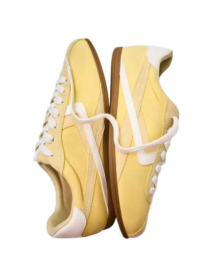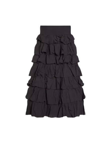 Um look feminino que combina a sofisticação com o casual. A blusa clara de manga comprida oferece um contraste suave com a saia preta de camadas, equilibrada por uma jaqueta de couro preta. Os sapatos amarelos conferem um toque de cor vibrante, ideal para um dia informal com estilo. A composição é perfeita para eventos casuais que pedem um toque de elegância.