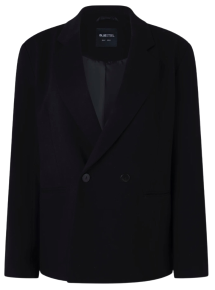 Um visual sofisticado, ideal para eventos noturnos, composto por peças de alfaiataria escuras. O blazer preto contrasta com um top tomara-que-caia estampado. A combinação é complementada por uma calça de corte reto, sapatos de salto baixo e uma bolsa com fivela, que adiciona um toque contemporâneo ao conjunto.