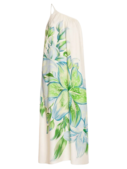 O vestido de um ombro só valoriza a região dos ombros e cria uma sensualidade elegante com o tecido leve e fluido. Para reforçar esse efeito de forma delicada, penteados presos como rabo de cavalo ou coque equilibram o visual. A bolsa de crochê adiciona modernidade através do contraste de texturas.