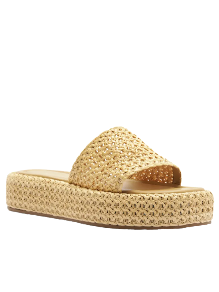 Um look feminino com elegância natural e charmosa. Um top leve de alças finas em tom nude coordena-se com uma calça de cintura alta em tom similar, proporcionando fluidez. Os acessórios incluem brincos de franjas douradas, uma bolsa de palha com detalhes em couro, e sandálias de plataforma de palha, completando um visual sofisticado e descontraído ideal para ocasiões casuais.