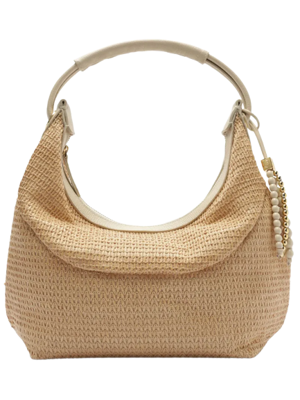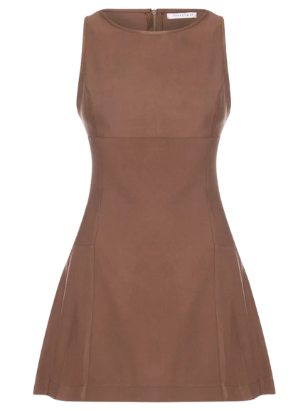Look feminino elegante com vestido marrom sem mangas, ajustado na cintura por um cinto marrom. Complementado por acessórios dourados, uma bolsa de palha e sapatos de palha trançada, criando um visual casual sofisticado.
