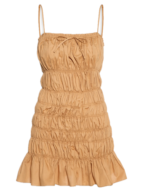 Este look feminino combina sofisticação e conforto com um toque moderno. A parte superior é um vestido bege franzido, estilo bata, destacando-se pelo caimento leve e alças finas, ideal para a primavera-verão. Para a parte inferior, calças de alfaiataria brancas garantem um contraste elegante e atemporal. Nos pés, tênis brancos com detalhes em bege oferecem praticidade e um ar esportivo-chique.Os acessórios complementam com maestria: um colar delicado dourado adiciona brilho sutil, enquanto brincos florais em tom dourado trazem um toque romântico. A bolsa marrom estruturada, com corrente dourada, complementa o visual com um toque clássico e sofisticado. Perfeito para mulheres que buscam um estilo elegante e despojado, este conjunto harmoniza elementos clássicos e contemporâneos.