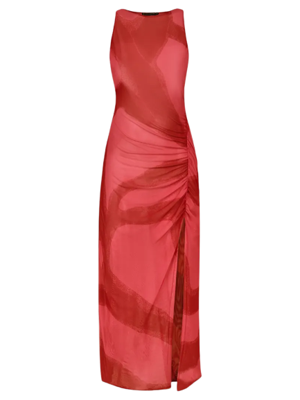 Look feminino sofisticado com um vestido vermelho vibrante e drapeado, ideal para eventos noturnos. O estilo é complementado por um par de brincos dourados elegantes e uma clutch texturizada bege, trazendo um toque de modernidade. Nos pés, o salto vinho em modelo slingback adiciona um contraste luxuoso e moderno ao visual.