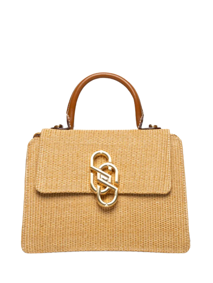 Look feminino elegante com top branco simples combinando perfeitamente com uma saia midi estampada em tons terrosos. Complementam-se as sandálias de salto bege, conferindo sofisticação. Acessórios como os brincos dourados, colar de contas e óculos de sol clássicos elevam o visual, enquanto a bolsa de mão texturizada em palha natural oferece um toque de modernidade.
