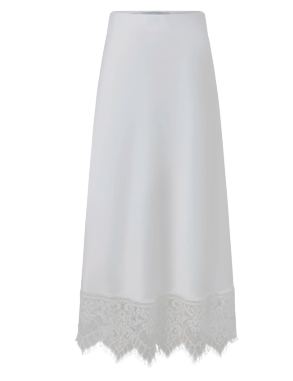Nesta composição a sensualidade está em alta através do tomara que caia vermelho, pelo modelo e cor que evidenciam o colo feminino. A saia de cetim com barrado em renda faz a diferença e traz a sofisticação combinada com a tamanca branca. Natal, Reveillon, Date, qual momento merece este look especial e cheio de informação de moda.