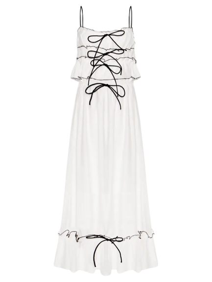 Look feminino elegante e leve, ideal para ocasiões especiais. O vestido longo branco apresenta delicados detalhes de amarração, conferindo um toque romântico. Os acessórios em preto, como a bolsa e os sapatos de salto com design sofisticado, criam um contraste moderno. As joias adicionam brilho e elegância.