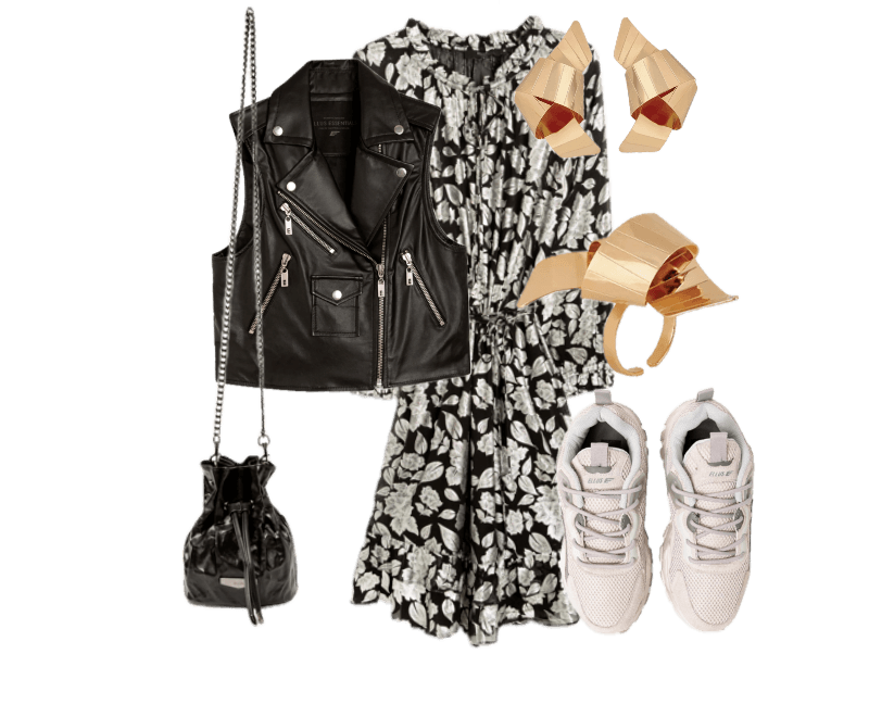 Este look feminino reflete uma elegância contemporânea e ousada. A peça única é um vestido preto com corpete estruturado e saia fluida transparente, proporcionando um jogo de texturas sofisticado. O blazer preto, de alfaiataria clássica, acrescenta um toque de formalidade e é perfeito para sobreposições. As botas western pretas, em couro, imprimem uma vibe robusta, reforçando o estilo audacioso. Nos acessórios, a bolsa preta com alças douradas e detalhes de pedras brilhantes confere um toque glamouroso. As pulseiras e anéis em prata, de design orgânico, oferecem um acabamento moderno e impecável. Este conjunto é ideal para eventos noturnos, equilibrando charme e atitude.